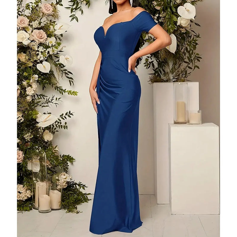 Command every gaze in our Women's Off-Shoulder Bodycon Dress. This stunning formal evening gown combines a daring off-shoulder neckline with a sleek short sleeve design and a dramatic high slit. Tailored to hug your curves and accentuate your silhouette, it’s the perfect statement piece for red carpet events, or any night where you want to shine with elegance and confidence.